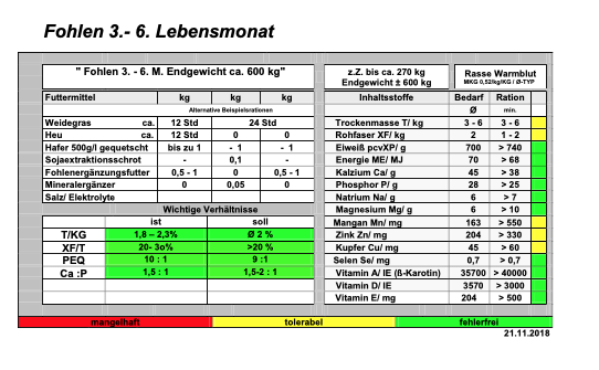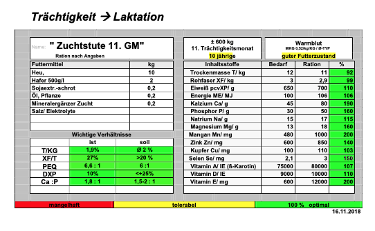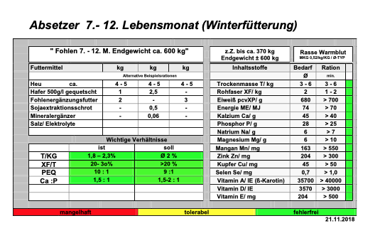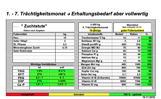 Unser erstes Rationsbeispiel ist für eine trächtige Stute im 8. GM / im 8. Trächtigkeitsmonat, den in der Niedertracht im 1. — 7. Trächtigkeitsmonat muss die Stute, wie in der letzten Episode begründet, moderat im Erhaltungsbedarf, jedoch bei vollwertiger Mineralergänzung gefüttert werden.
