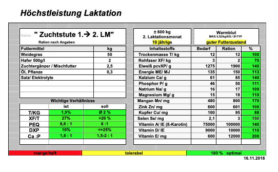 Erst ab dem 8.Trächtigkeitsmonat (Rationsbeispiel 8. GM) steigt der Bedarf an. Dann im letzten Trächtigkeitsmonat (Rationsbeispiel 11. GM) sollte bereits auch schondasselbe Zuchtfutter gefüttert werden, dass nach der Geburt eingesetzt werden soll. Die Höchstleistung aber erreicht die Zuchtstute erst zum Ende des 1. Laktationsmonats. Hierzu (Rationsbeispiel 2. LM).